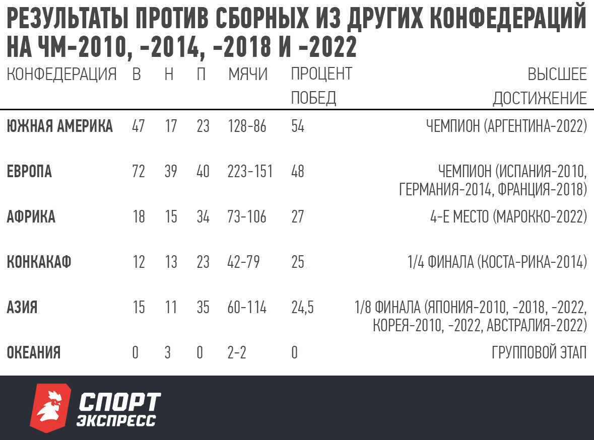 Вместо того чтобы рассуждать о причинах и справедливости такой ситуации, лучше посмотреть на это с чисто спортивной точки зрения — насколько сборные из остальных частей света конкурентоспособны на фоне европейцев. Только статистика, ничего более. Мы взяли четыре последних чемпионата мира — 2010, 2014, 2018 и 2022 годов. С одной стороны, этого достаточно, чтобы делать какие-то выводы, с другой — это относительно свежий и релевантный срез. Кроме того, эти турниры проходили на четырех разных континентах — Африке, Южной Америке, Европе и Азии, то есть сборные из каждой части света побывали в «домашних» условиях.