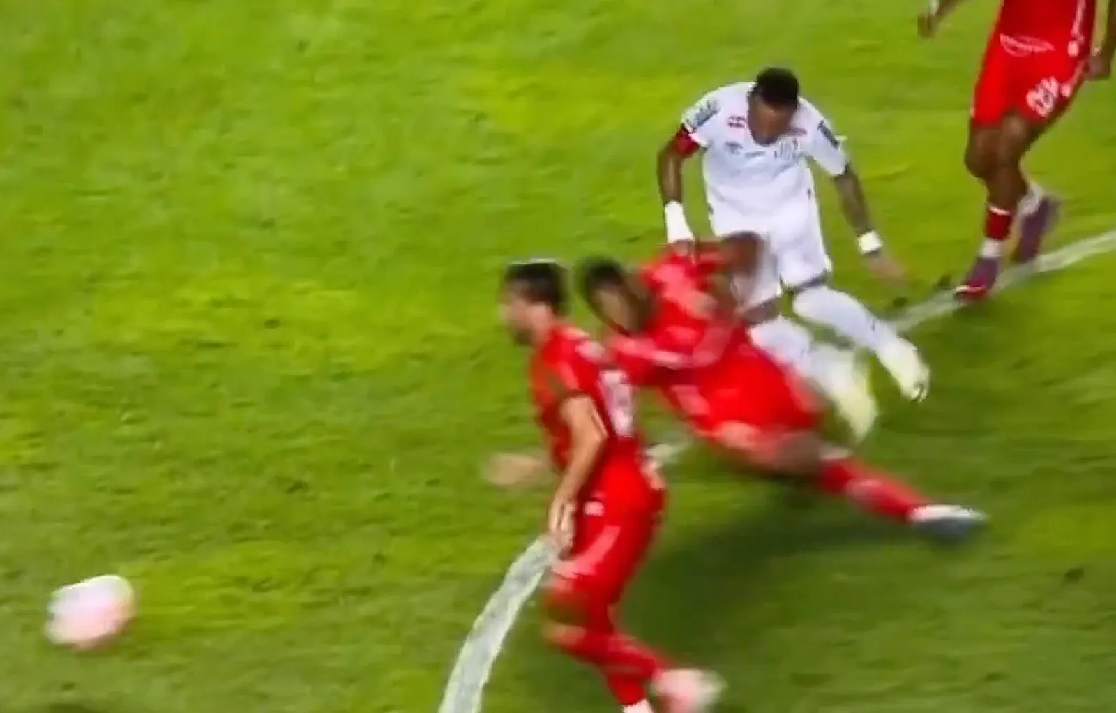 Только посмотрите, как в капитана «Сантоса», только восстановившегося от травмы колена, влетели спустя всего 10 минут после его возвращения на поле! Удивительно, что после такого Ней еще смог доиграть матч и даже отдал голевую передачу!